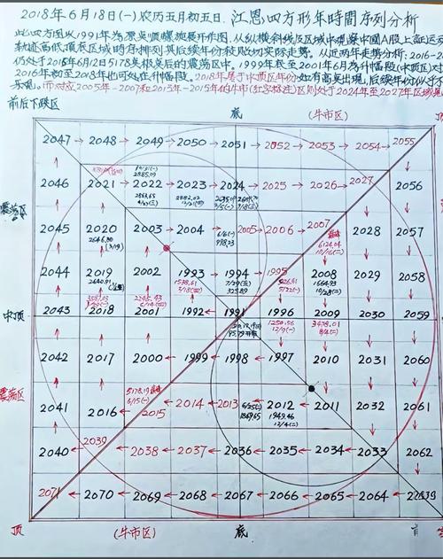 $东方财富(SZ300059)$ 最近流传比较广泛这张江恩方正图是2018年手绘保存到现在,红色字代表牛市黑色字代表熊市。 2005年半格,2006年一整格,2007年半格,代表2005年下半年进入牛市就是对应998点见底。2005年6月进入牛市,到2007年下半年进入熊市。 2013年下半年进入牛市到2015年下半年进入熊市 2024年在中轴的一半,相对应就是924行情的反转进入牛市的转折阶段,...