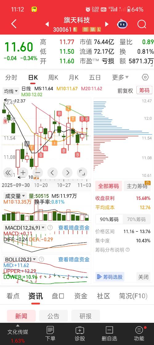 $旗天科技(SZ300061)$11.66,±0.02。刚好够手续费。