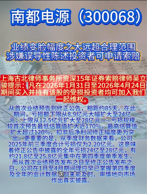 $南都电源(SZ300068)$ 南都电源(300068)业绩变脸幅度之大远超合理范围,涉嫌误导性陈述投资者可申请索赔;从首次业绩预告到修正公告,相距约85天。在此期间,亏损额下限从8.9亿元大幅扩大至24亿元,上限从12.5亿元扩大至28亿元——亏损规模较首次预告最低估算值扩大近170%,最高估算值扩大超过120%,扣非后净利润修正幅度更为突出。更重要的是,从季度财务数据来看,公司2025年前三...
