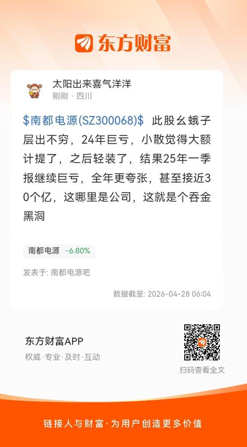 $南都电源(SZ300068)$此股幺蛾子层出不穷,24年巨亏,小散觉得大额计提了,之后轻装了,结果25年一季报继续巨亏,全年更夸张,甚至接近30个亿,这哪里是公司,这就是个吞金黑洞