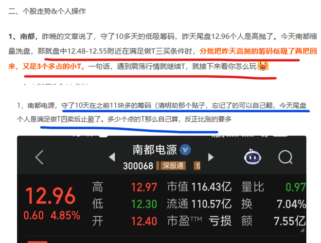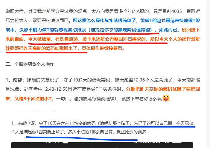一、大盘 今天市场上证继续上攻压力位,创业板是微放量创新高了,板块方面还是锂矿和算力租赁领涨。前天尾盘遇压力位高抛,昨天市场洗盘低吸,节奏踏对你也就成功了大半(昨晚的发文也剧透了今天冲高的走势,具体可以看昨晚的分享文章→遇阻后的震荡,不知道该看空还是看多?看这篇来解惑)。接下来怎么做,从盘面来看,近期还是有继续上冲的动能,所以大方向个人是会继续持股为主。 二、个股走势&个人操作 1、南都电源,技术...