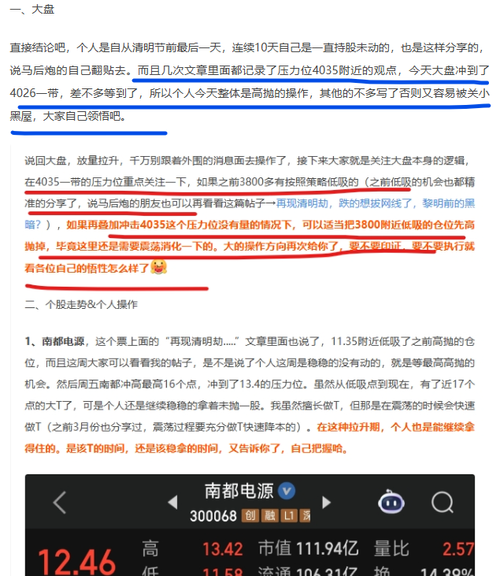 好不容易码的字,被删了几次贴,说真话又不让说了,简单再写一下,再发不出去就只能说今天的看法与大家无缘了。 一、大盘 直接结论吧,个人是自从清明节前最后一天,连续10天自己是一直持股未动的,也是这样分享的,说马后炮的自己翻贴去。而且几次文章里面都记录了压力位4035附近的观点,今天大盘冲到了4026一带,差不多等到了,所以个人今天整体是高抛的操作,其他的不多写了否则又容易被关小黑屋,大家自己领悟吧。...