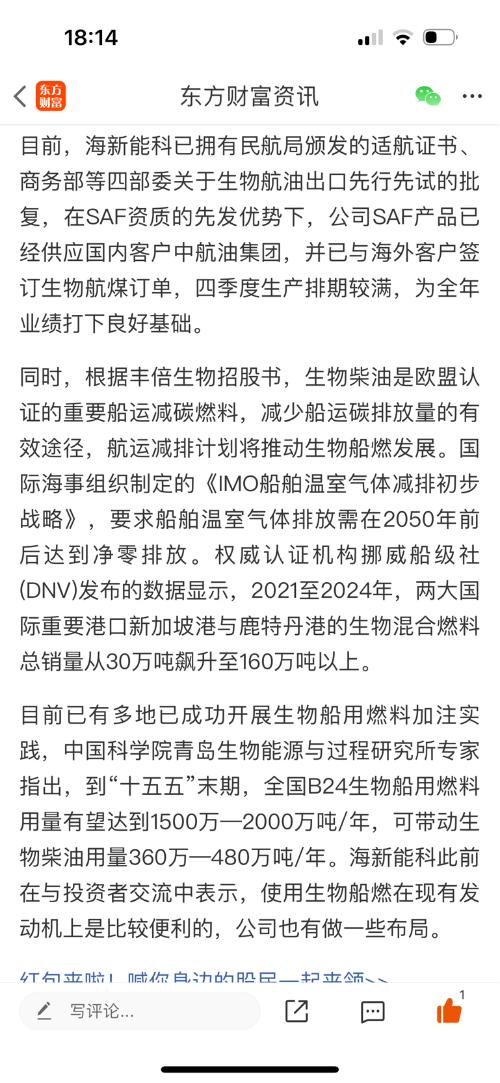 资讯 生物航煤、生物船燃赛道市场空间放大,海新能科推动生物能源产业共赢
