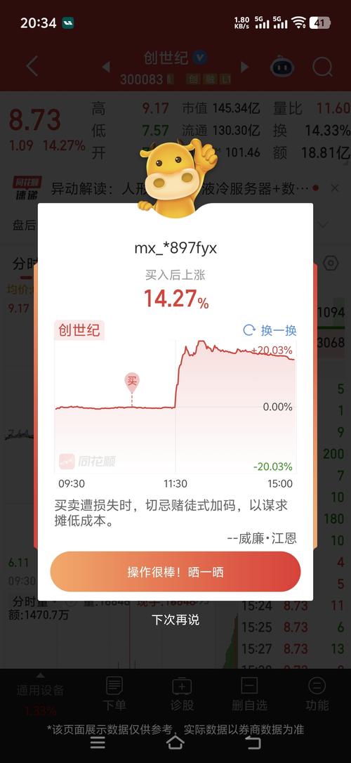 $创世纪(SZ300083)$ 8.5左右进场的,加仓把成本拉到8.13,今天上午还补仓了,下午突然拉升,我发现我的股数怎么少了原来是涨幅过大,一下到条件单的卖点了,行吧,反正赚钱了,舒服。还剩1万块底仓留着。