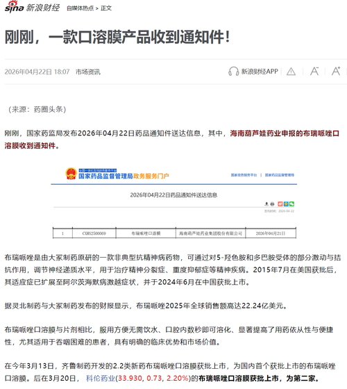 4月22日国家药监局发布了海南葫芦娃药业布瑞哌唑口溶膜的通知件。口腔速溶膜剂这个剂型,正在从“概念”走向“落地”——审评通道已经打通,审评标准正在成熟。 康芝药业在研的儿童氢溴酸右美沙芬口腔速溶膜剂,和葫芦娃的口溶膜走的是同一个技术路线:无需饮水、入口即化、剂量精准,专门解决儿童吞咽困难、依从性差的痛点。葫芦娃已经把口溶膜的审评通道趟出来了,康芝后续报批时审评效率会大幅提高。同样扎根海南、同样做儿...