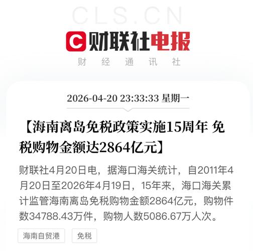 $康芝药业(SZ300086)$【海南离岛免税政策实施15周年免税购物金额达2864亿元】财联社4月20日电,据海口海关统计,自2011年4月20日至2026年4月19日,15年来,海口海关累计监管海南离岛免税购物金额2864亿元,购物件数34788.43万件,购物人数5086.67万人次。(来自财联社APP)