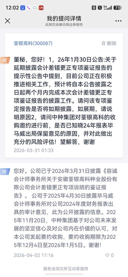 【问】董秘,您好!1,26年1月30日公告:关于延期披露会计差错更正专项鉴证报告的提示性公告中提到,目前公司正在积极推进相关工作,预计将自本公告披露之日起两个月内完成本次会计差错更正专项鉴证报告的披露工作。请问该专项鉴定报告是否将如期披露,如展期,请说明原因2,请问中种集团对荃银高科的收购邀约进行前,是否已知晓24年报表毕马威出局保留意见的原因,并对此做出充分的风险评估!望解答,谢谢【答】荃银高科:您好。公司已于2026年3月31日披露《容诚会计师事务所关于安徽荃银高科种业股份有限公司会计差错更正专项说明的鉴证报告》。 公司于2025年4月30日披露毕马威会计师事务所对公司2024年度财务报表出具的审计意见,此为公开披露的信息。2025年11月20日,中种集团基于对公司未来发展的坚定信心及对公司内在价值的认可,对本公司发起要约收购,要约收购期限为2025年12月4日至2026年1月5日。谢谢!