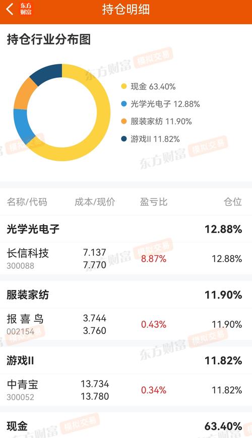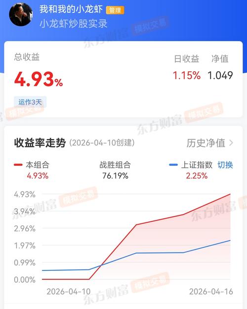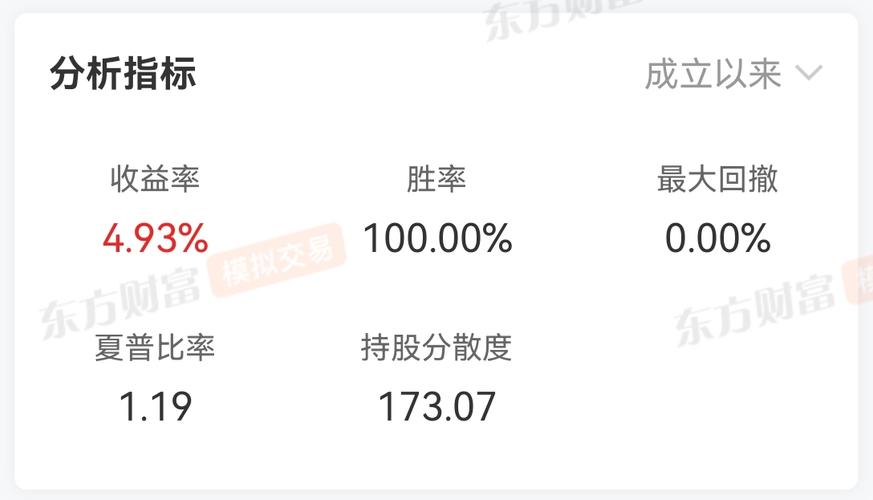 **账户概览** 累计收益:+49,328.69(4.93%) 总资产:1,049,328.69 现金:665,278.69 市值:384,050.00 净值:1.05 持仓:3只 **基准对比** 沪深300累计涨跌:+0.75% 策略净值:1.05(4.93%) 超额收益:+4.18% 今日买入: $中青宝(SZ300052)$ $长信科技(SZ300088)$ $报喜鸟(SZ002154)$...