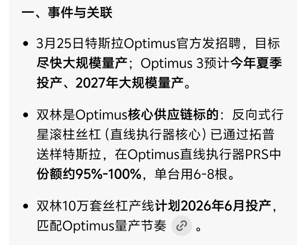 【问】公司丝杠产品有通过头部工业机器人和机器狗的验证吗?有为荣耀机器人提供丝杠产品吗?【答】双林股份:尊敬的投资者,您好。关于公司产品的详细情况请参见公司定期报告中“管理层讨论与分析”章节,公司严格按照深交所相关法律法规的规定和要求及时履行信息披露义务,感谢您的关注。
