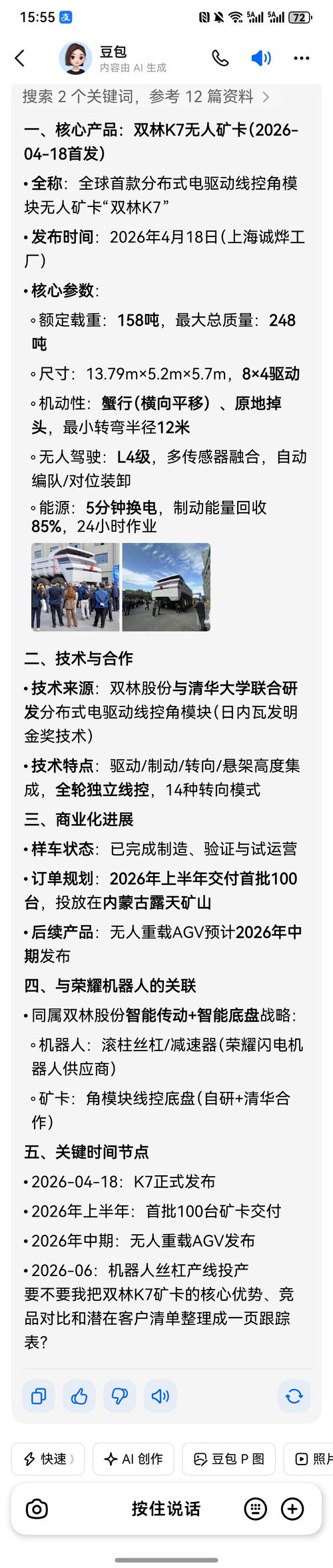$双林股份(SZ300100)$248吨的无人矿卡,售价500万一台的话,100台就是5个亿。这还没算年中要公布的重载agv还有后面的港口车。昨天还和几家大型公司签订了战略合作协议。双林和内蒙古鄂尔多斯高新区建立深度合作当地建厂。明年1000辆矿卡加重载agv加港口车,销售收入50亿也不是不可能。光是角模块整车这一块的收入就相当于2025年全年收入。今年的中报值得一看。
