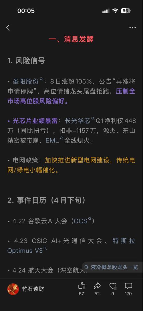 $中国卫星(SH600118)$$航天电子(SH600879)$$乾照光电(SZ300102)$ 一、消息发酵 1.风险信号 •圣阳股份:8日涨超105%,公告“再涨将申请停牌”,高位情绪龙头尾盘抢跑,压制全市场高位股风险偏好。 •光芯片业绩暴雷:长光华芯Q1净利仅448万(同比扭亏),扣非-1157万,源杰、东山精密被带崩,EML全线熄火。 •电网政策:加快推进新型电网建设,传统电网/绿电小幅催...