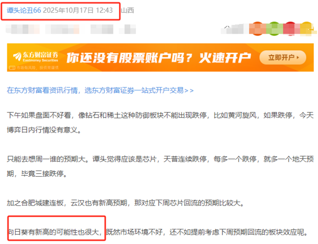 上周五马前炮的午盘,大家都看到了吗?今日向日葵大涨,但凡周五看到并低吸的家人,今天拉升,随便兑现,踩对节奏 回顾上周五的预判,谭头准确指出本周的市场预期,当时我就说了,芯片板块本周回流的可能性非常大,理由有两个: 1、天普股份连续跌停后,每多一个跌停,就多一个地天板的预期,毕竟三接跌停。 2、合肥城建连板,云汉也有新高预期,预判本周芯片回流预期较大。 既然预判芯片要回流,那作为芯片里的人气标的向日...