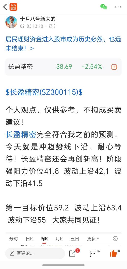 $长盈精密(SZ300115)$ 个人观点,仅供参考,不构成买卖建议 长盈精密的朋友大家好!自去年12月份长盈精密创出47.99新高之后,一直处于跌势,股价反应出的就是情绪特征,从兴奋到失落再到悲观,我在2月3号分析时长盈精密与大盘情绪相关联,导致了一定的非理性波动,当时的压力位41.8波动上沿42.1波动下沿41.5大家看一下春节前一周长盈精密最高价41.62正是触及到了波动下沿区间,春节过后由...