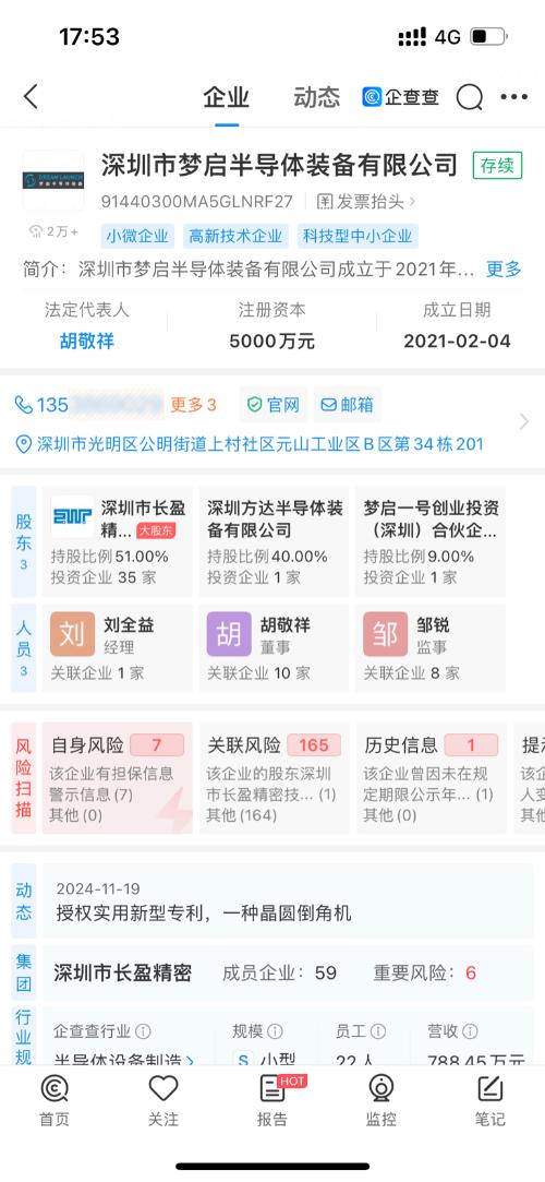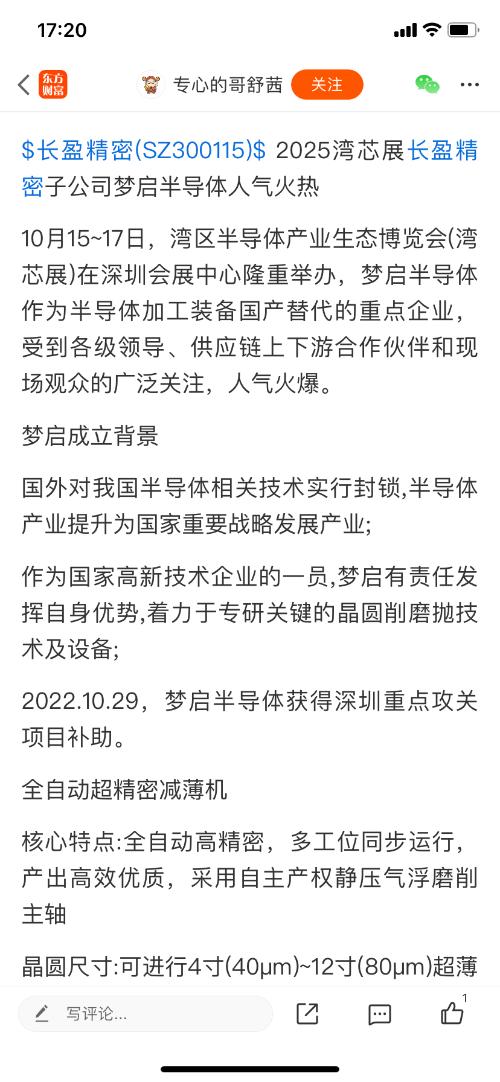 $长盈精密(SZ300115)$ 截图中的消息真实可靠。长盈精密在子公司梦启半导体中直接持股51%(根据企查查等权威工商信息及公司公告)。 若消息属实,长盈精密具备半导体概念:梦启半导体专注于半导体加工装备(如晶圆减薄机、抛光机等)的研发与生产,是半导体制造环节的关键设备供应商,且技术已达国际水准并实现批量出货,因此长盈精密通过控股该子公司深度切入半导体设备领域,符合半导体概念的定义。