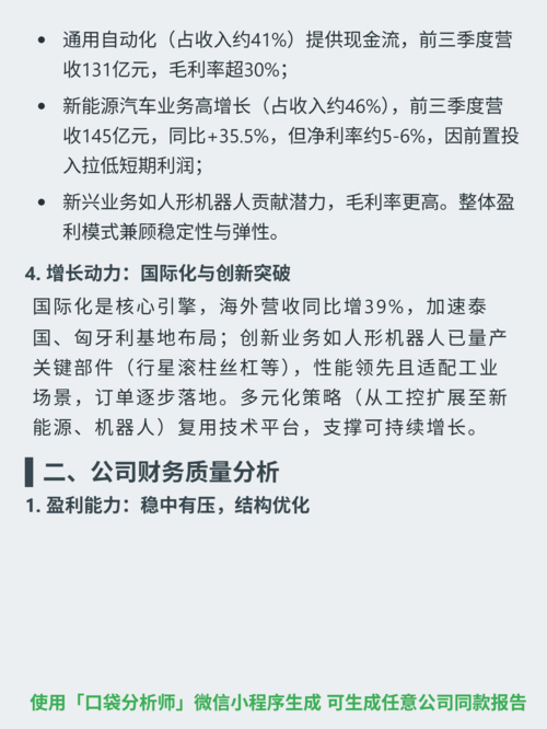 $汇川技术(SZ300124)$$汇川技术(SZ300124)$$英威腾(SZ002334)$最近研究汇川技术,核心是工业自动化龙头的多元化增长与行业复苏共振。 核心逻辑:工业自动化领域龙头,伺服系统市占32%(内资第一)、变频器22%;商业模式以技术研发(年投入超30亿,占营收近10%)和规模效应为双壁垒,多产品线(工控、新能源车、人形机器人)协同提升客户粘性。 财务亮点:2025前三季度营收同...