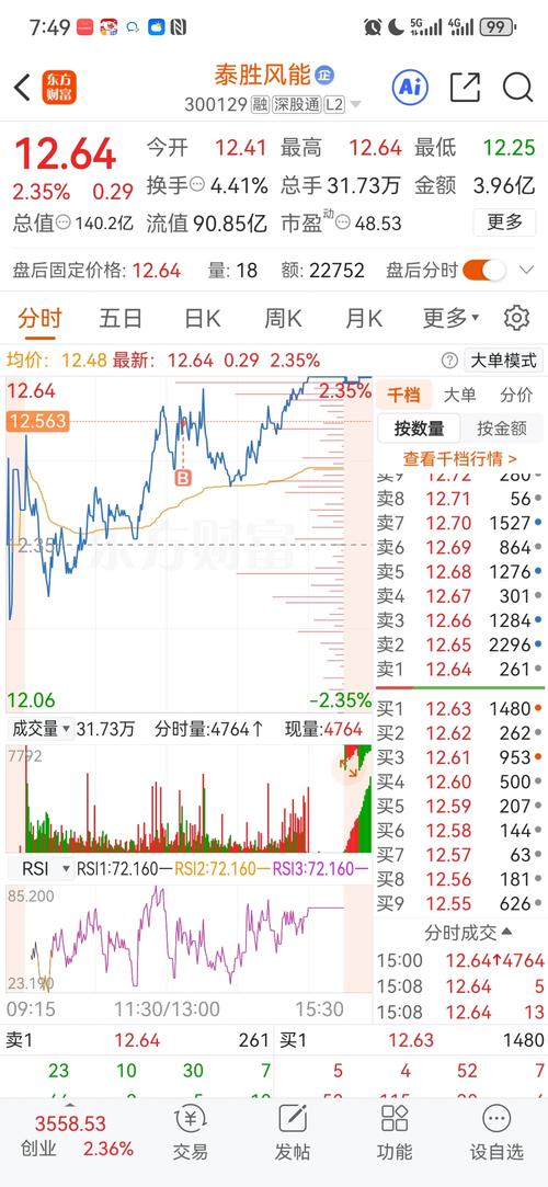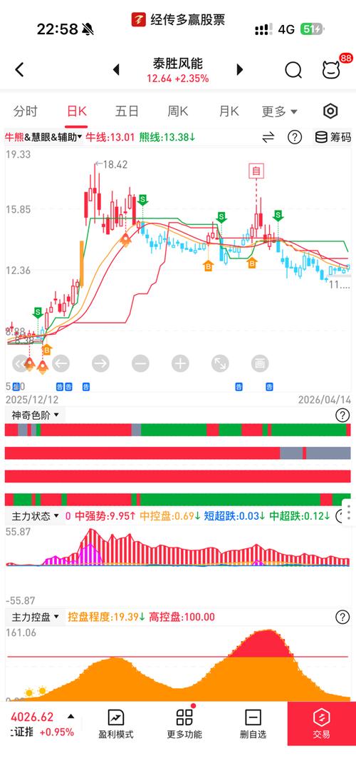 $泰胜风能(SZ300129)$泰胜风能(300129)后市走势深度分析 一、当前盘面核心信号拆解 1.价格与趋势维度 •当前价格:12.64元,当日涨幅2.35%,处于下跌趋势中的弱势反弹阶段。 •牛熊线状态:牛线13.01元、熊线13.38元,熊线较昨日下探0.6元。当前股价(12.64元)同时跌破牛线、熊线,属于典型的空头趋势主导: 牛线13.01元是第一强压力位,熊线13.38元是第二强压...