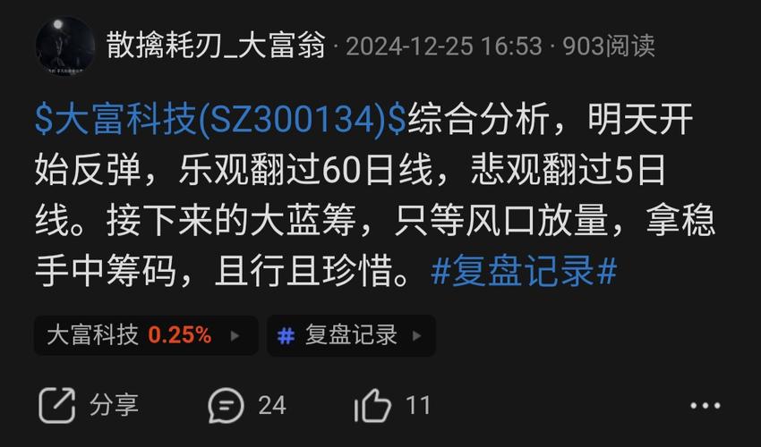 $大富科技(SZ300134)$#收盘点评#如果我是操盘手,明天就拉涨停,拉个二个半以上的涨幅打开空间,庄赚钱了散户又会其乐融融拼命往前冲。局面……你们自己想象。