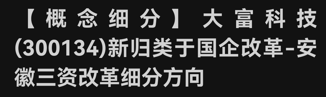 $大富科技(SZ300134)$【概念细分】大富科技(300134)新归类于国企改革-安徽三资改革细分方向。 国企改革-安徽三资改革细分方向指的是:2025年10月24日,据“安徽发布”,《安徽省推进“大资产”统筹管理总体工作方案》正式印发。下一步,将打好“制度拳”,构建改革政策体系。协同省级相关部门单位,部署国有“三资”各领域具体改革工作,指导市县分层级推动,构建系统完备、协同高效的政策支撑和制...