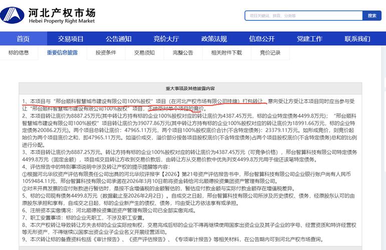 根据河北产权市场有限公司(以下简称“河北产权市场”)公开信息,河北顺德城市发展集团有限公司、河北顺德投资集团资产管理有限公司分别于2026年4月1日在河北产权市场公开挂牌转让持有的邢台顺科100%股权、邢台智算100%股权,两个项目打包转让,挂牌总底价为4.8亿元。该2标的于昨日(4月15日)顺利成交,目前河北产权市场网站显示该2标的交易已结束,经咨询(网站有电话,自己也可去验证)该2标的已顺利成...