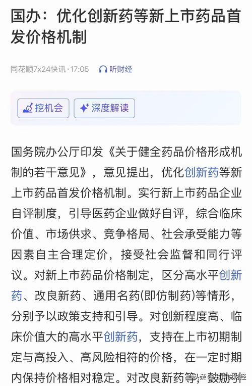 $沃森生物(SZ300142)$ 4月14日,国务院办公厅发布《关于健全药品价格形成机制的若干意见》,提出14条举措。 意见指出,优化创新药等新上市药品首发价格机制。实行新上市药品企业自评制度,引导医药企业做好自评,综合临床价值、市场供求、竞争格局、社会承受能力等因素自主合理定价,接受社会监督和同行评议。对新上市药品价格制定,区分高水平创新药、改良新药、通用名药(即仿制药)等情形,分别予以政策支持...