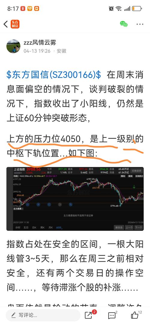 $东方国信(SZ300166)$ …上证指数进入震荡区域,,后面要留意5日线的得失,在5日线之上运行,那么盘面依然是轮动…… 在前面几天的帖子里面多次提到4050的压力位,今天恰巧60分钟触及4050点回落, 这就是中枢的作用,中枢的压力: 今天的最高点4050,,这也并不是什么精准,这是触及到了上一级别的中枢下轨的位置,而出现的盘面的分时三个小时的回落,,从60分钟结构看会很清晰: 如下图: 第...