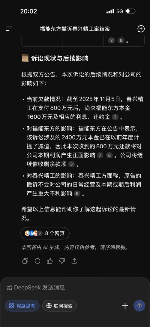 福能东方近期有两起诉讼案有新消息,具体如下: -福能东方诉春兴精工合同纠纷案:2025年11月5日,福能东方发布诉讼进展公告称,其起诉苏州春兴精工的合同纠纷案已撤诉。福能东方于2025年3月提起诉讼,广东省中山市第二人民法院于7月18日受理,案号为(2025)粤2072民初20097号,诉讼金额合计5607.13万元。案件审理过程中,春兴精工表示愿意支付部分本金,并同意后续支付剩余款项,福能东方考...