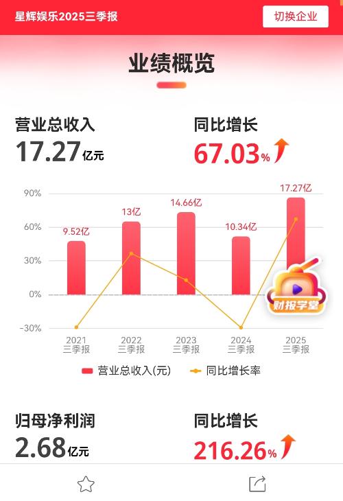星辉娱乐三季度营业收入同比增长67%,净利润同比增长216.26%,每股收益0.22,去年同期是-0.19,增长非常大,这也是我卖出中海达买入星辉娱乐的原因。