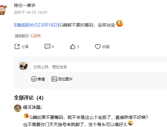 $捷成股份(SZ300182)$板块热点、题材热点……短期涨跌逻辑无一支撑强势上涨,一群嘴残的小咔拉米儿一旁和滋泥儿玩去啵。。。