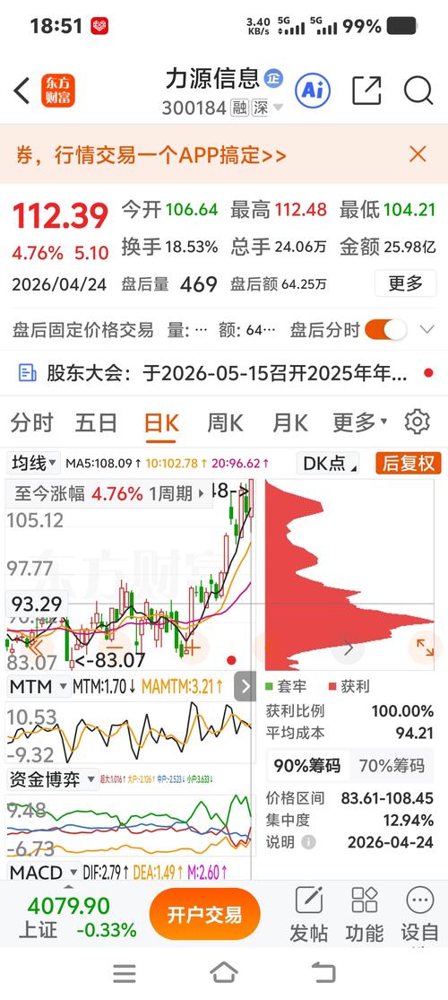 各位朋友,早上好,我是老陈! 今天是4月24日,周五,昨天大盘冲高回落,收4093,跌0.32%,成交放大到1.23万亿,但跌多涨少,通信板块整体调整,只有沪电股份逆势涨了3.24%,我按计划接回了中天科技(33.55元)和力源信息(12.98元),其他票没动。 今天我的核心思路:大盘放量滞涨,短线有继续回踩的可能,不追高,手里现金等跌。持仓股以持有和做T为主,重点盯住通宇通讯的止损线。 下面讲具...
