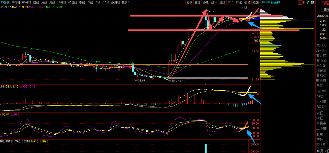 。已经非常强悍了,并没有出现收绿。明天等待一个突破,大概在10点半之前,要是过不了,那就继续吞没今天的阳线。要是顺利突破,那就升级30F级别的反弹,那就往着42去了,最后能升级成日线级别的,那就往52甚至往新高去了