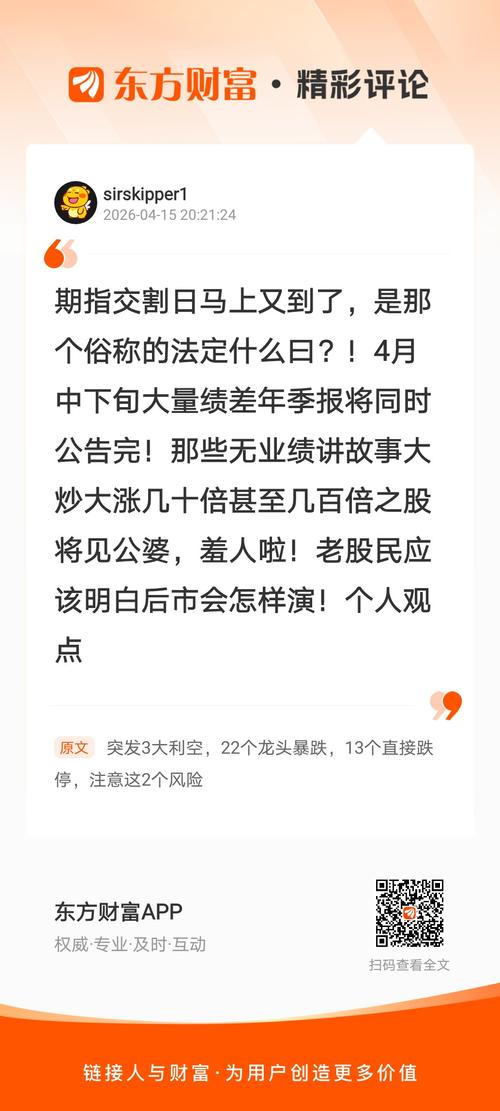 期指交割日马上又到了,是那个俗称的法定什么曰?!4月中下旬大量绩差年季报将同时公告完!那些无业绩讲故事大炒大涨几十倍甚至几百倍之股将见公婆,羞人啦!老股民应该明白后市会怎样演!个人观点 我在《突发3大利空,22个龙头暴跌,13个直接跌停,注意这2个风险》的评论获得了大家的关注。