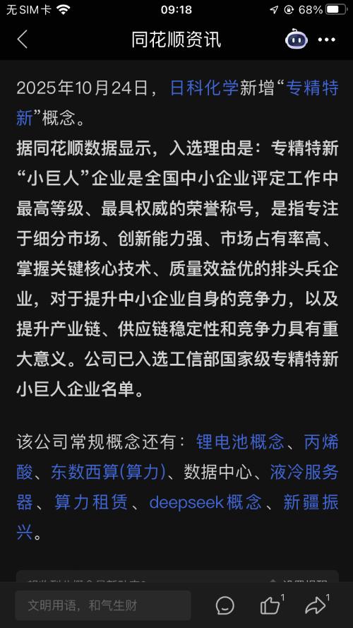 $日科化学(SZ300214)$日科化学新增“专精特新”概念。