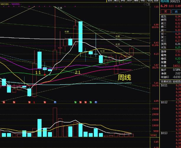 周线图,第一根黄色的下压线已经突破,目前在第二根绿色线突破的过程中,该线本周阻力是6.35元.周二高点正是6.35元.等突破6.35元,就是站上6.52元,这个价格是多空分界岭.一旦站上6.52元,股价进入强势,随时上攻7元,7元-7.30元一旦突破,就看高8.40-8.80元.就是这么个情况.心里有数了吧?怎么操作乘现在自己去琢磨一下,不然一涨不知道该怎么办了.