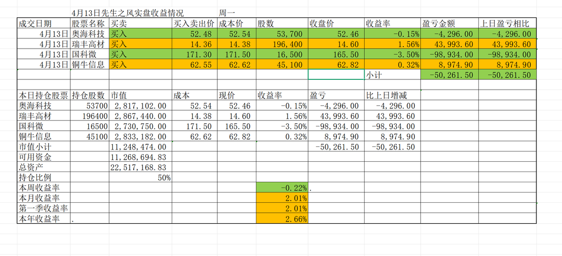 【4月13日先生之风复盘】小亏也可接受 今天组合选择了奥海科技、瑞丰高材、国科微和铜牛信息,结果建仓了表现一般,但除了国科微,其他票也不算太弱。最终今天组合是四票两盈利两亏损,总体微亏,也可接受,明天是否新建组合,也要看今日组合能否全身而退。
