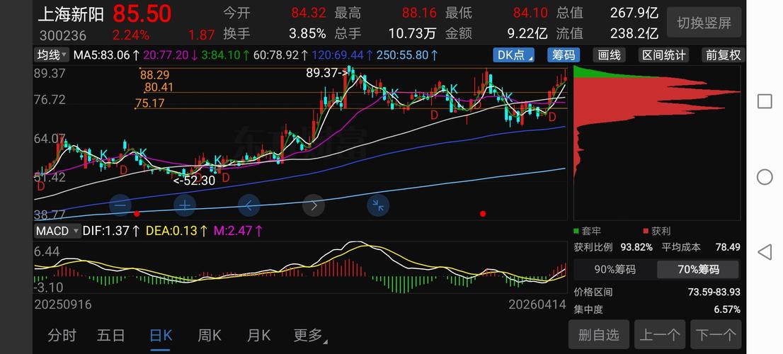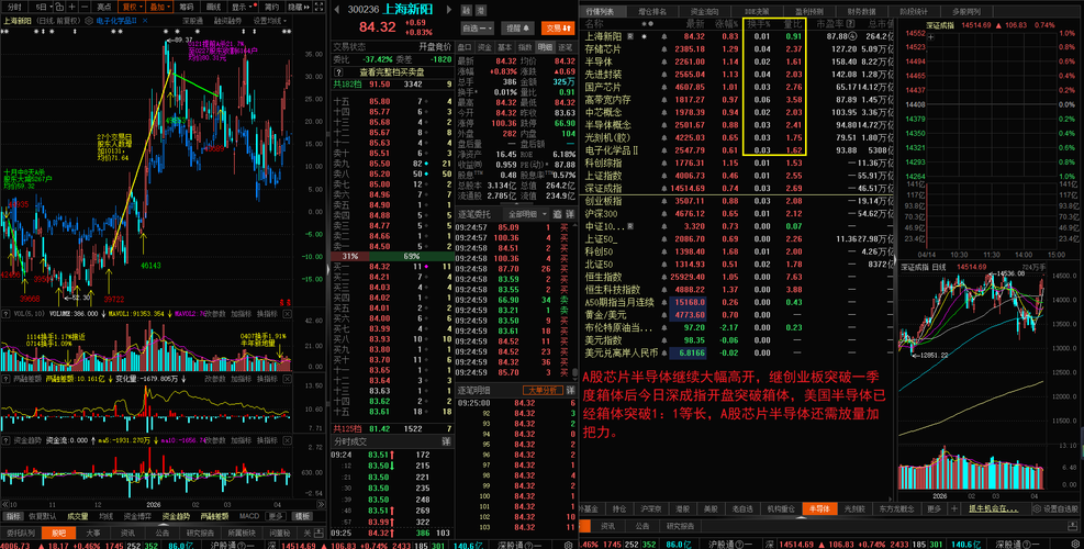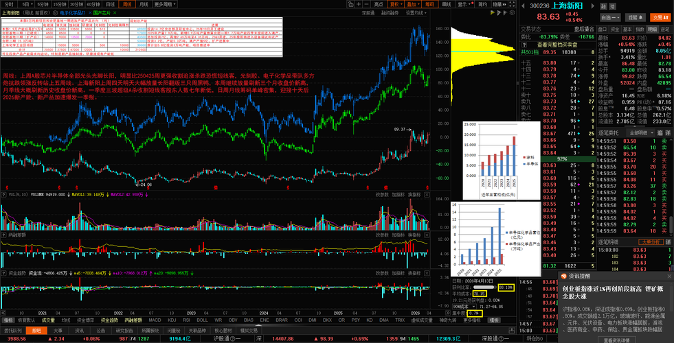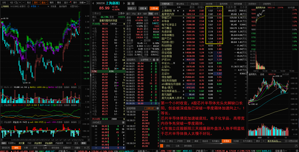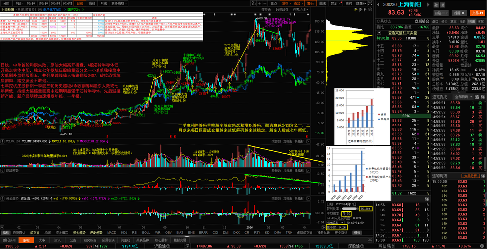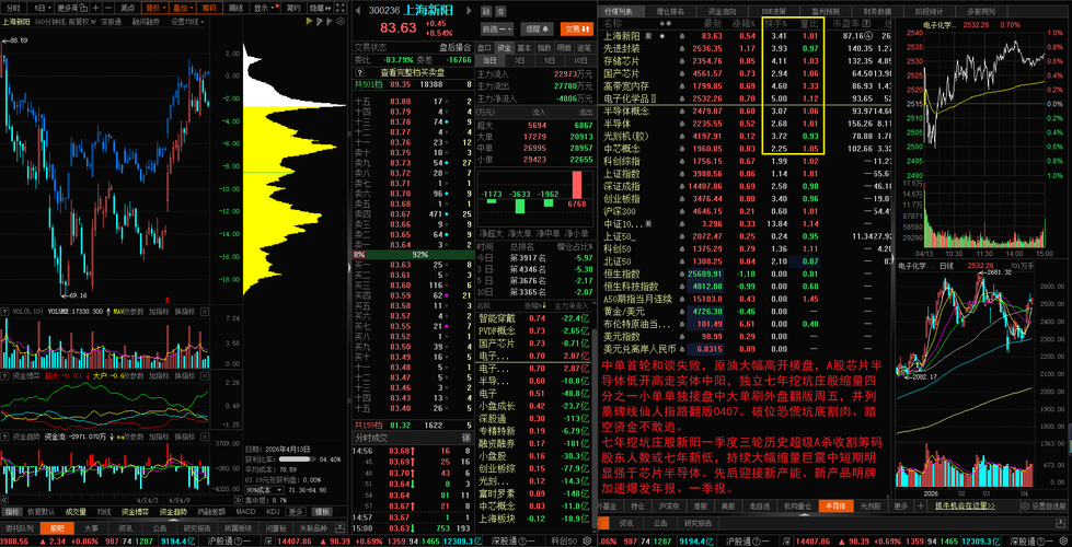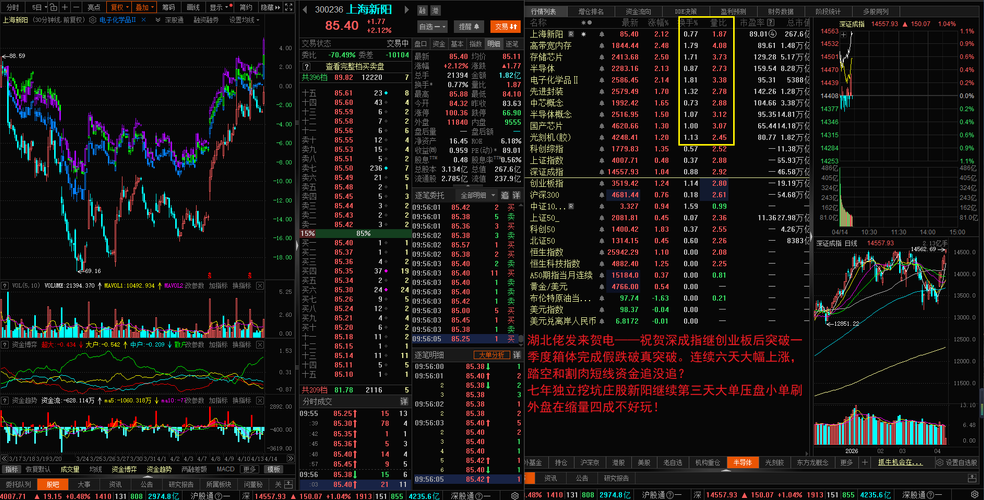 - 日线:A股芯片半导体继续缺口光头光脚中长阳,创业板深成指陆续再次率先假跌破真突破明显比25年0407恐慌缺口长阴后更强,芯片半导体持续放量加速上涨,电子化学品、高带宽内存率领快速填坑刷新二月底历史新高在即。七年挖坑独立庄股新阳连续5天日线倍量,独立安排三炷香赶走追涨杀跌短线客迎接11天后2026新产能、新产品明牌加速爆发最牛一季报。 四个月箱体上海新阳融资盘持仓占比减少三分之一,筹码高度密集翻版四季度箱体上台阶在即,筹码成本平均提高20+,三轮超级A杀股东人数七年新低。