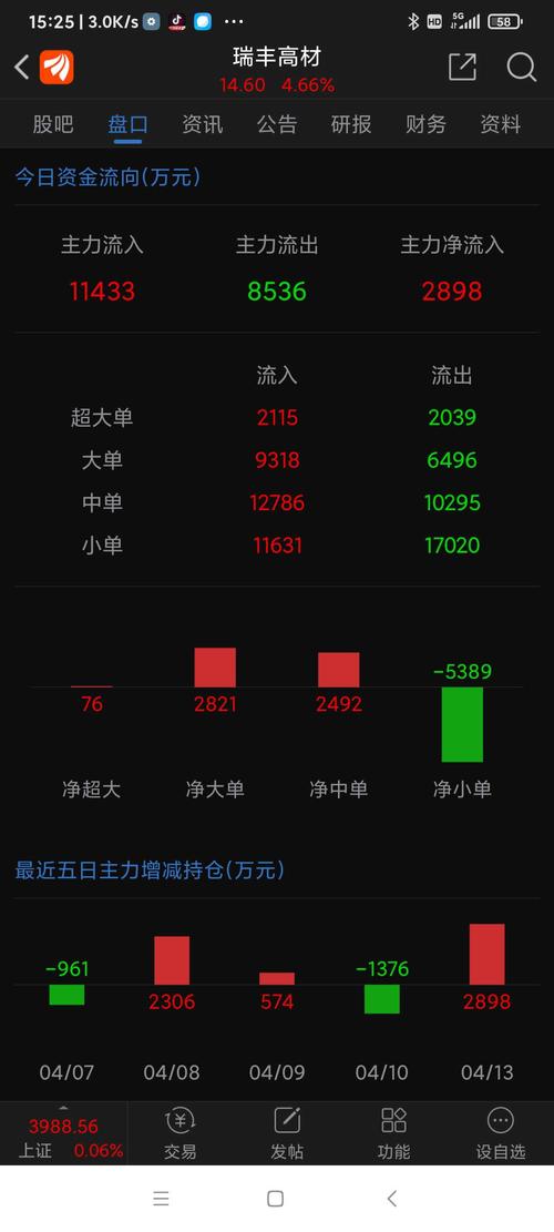 $瑞丰高材(SZ300243)$ 收盘数据 •收盘价:14.60元,涨幅+4.66%(+0.65元) •开盘:13.88元;最高:14.66元;最低:13.86元 •成交量:25.28万手;成交额:3.64亿元 •换手率:12.96%(交投活跃) •市盈率TTM:370.99(估值极高) 1.分时走势:单边走强,稳中有升 •小幅低开后快速企稳,全天震荡上行 •午后一度涨超5%,尾盘小幅回落,收在全...