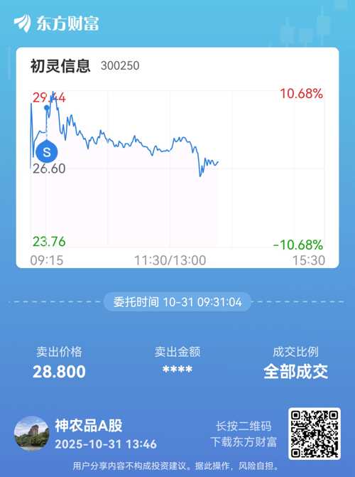 神农品A股 更新于 今天 14:08 173次浏览 $初灵信息(SZ300250)$都卖干净了,赚了8万多,谢谢主力。 ![呲牙 [呲牙]](//gbfek.dfcfw.com/face/emot_default/emot21.png) ![呲牙 [呲牙]](//gbfek.dfcfw.com/face/emot_default/emot21.png) 委托标的: