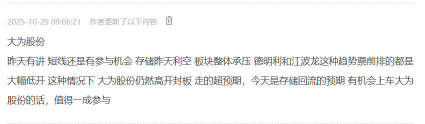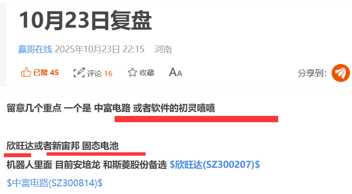 艾薇chuaaiwei 更新于 今天 14:14 560次浏览 通过详细分析,逐步熟悉起来,就会越来越好。 原本想着做个10月份的总结,一直关注飞龙的都知道,本月基本都没什么运作,只是再默默的格局,不过结果还不错,可以说是最近五年最佳结果。 想关注飞龙,一起去运作的,请耐心看完。 有朋友着急,为什么别人的涨,而自己的为什么不涨?一句话,就是着急买早了。这个市场,除了老庄还有柚子和量化。 一直追涨,后面必然有回调,就会出现你的被套,甚至套牢。关注飞龙的,请先熟悉其运作方式。 举例几个,说明一下: $鹏辉能源(SZ300438)$... 169