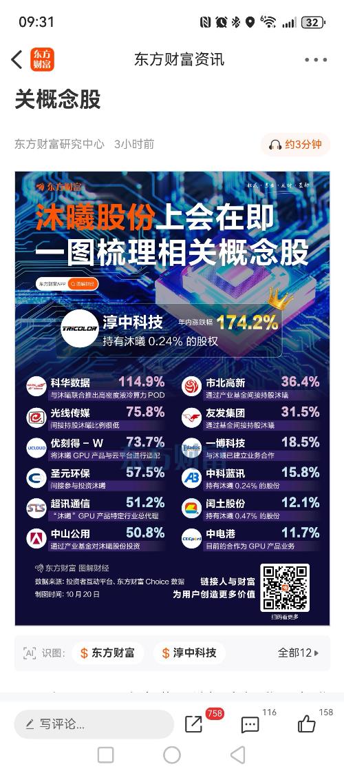 上次发沐曦概念梳理,没有列举沐曦的参股方这一栏目,有个股友说把最重要的“中山公用”、“九安医疗”等,这么重要的股票丢掉了,记得前年九安医疗投资杭州某私募基金,香港什么财团,它们又间接投资具有潜质的科技股,其实都是故事,都是在画饼,有没有写不关键,关键是股票本身有资金来炒作。中山公用本身没有这方面的概念,它只是持有股份。 又如当时大盘正好回踩,有五六个人买入沐曦概念股赔钱了,留言谩骂,概念梳理,不是...