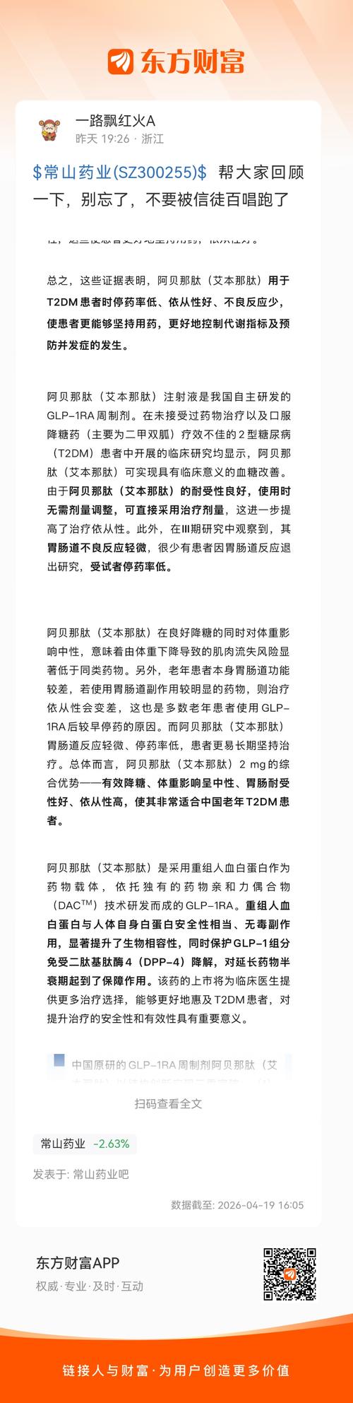 $常山药业(SZ300255)$出身高贵,预定爆款,虽还未获药监局批件,但已获医保局预定进医保!开启爆款预售模式!!! 常山的逻辑演进推理: 第一,获得药监局认可,拿到批文完成从0到1从无到有的质变。阿贝那肽隆重问世! 第二,获得医生的认可,开出第一批处方用于第一批真实的患者。初步形成阿贝那肽营收。 第三,获得患者的认可,患者用药后疗效良好,副作用微小,依从性好停药率低,形成连续的良性用药。通过患...