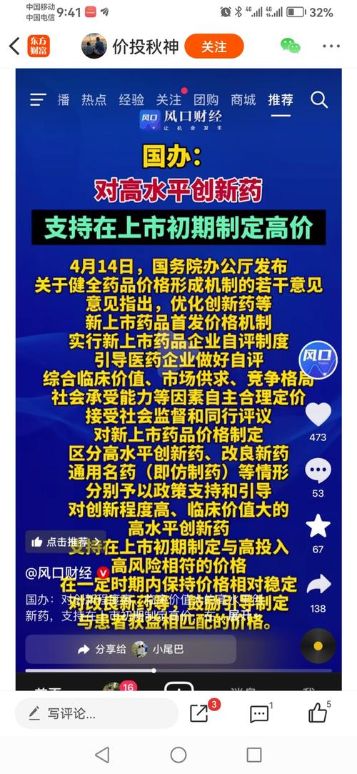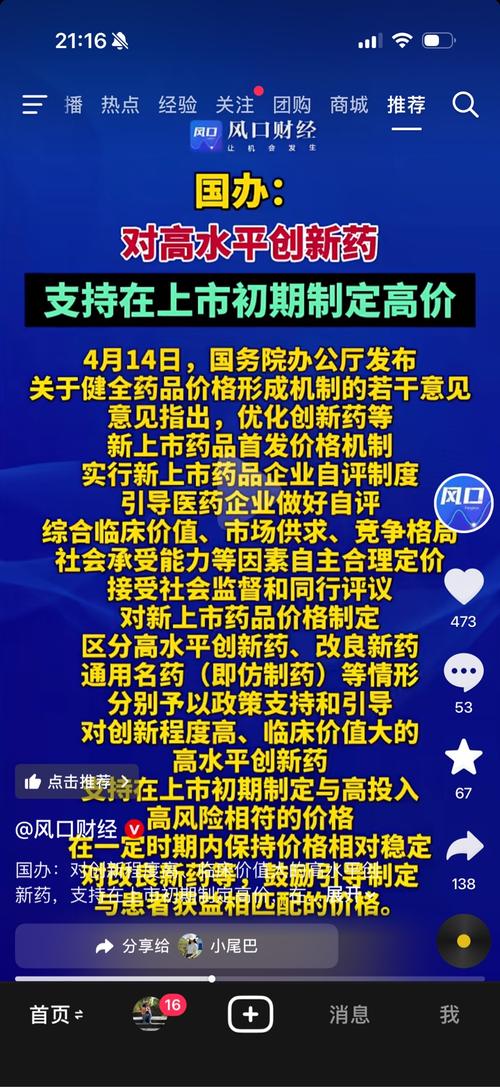$常山药业(SZ300255)$国家给常山的支持! 国务院办公厅发布《关于健全药品价格形成机制的若干意见》,提出14条举措。 意见指出,优化创新药等新上市药品首发价格机制。实行新上市药品企业自评制度,引导医药企业做好自评,综合临床价值、市场供求、竞争格局、社会承受能力等因素自主合理定价,接受社会监督和同行评议。对新上市药品价格制定,区分高水平创新药、改良新药、通用名药(即仿制药)等情形,分别予以政...