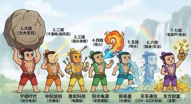 这张把创业板权重股拟人化为“葫芦娃”的图,形象地道出了目前A股最赚钱的几个赛道。作为调研员,我们深入解析一下这七位“兄弟”背后的硬实力: 一、“力大无穷”的老大:宁德时代(动力电池) 宁王依然是创业板的定海神针。尽管市场竞争激烈,但其一季度归母净利润依然保持了近50%的高速增长。在全球动力电池和储能领域,宁德时代依然拥有极强的定价权和规模效应,是创业板的“基本盘”。 二、“易中天”三兄弟:算力时代...