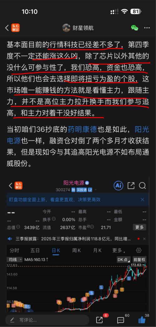 持仓解析: $阳光电源(SZ300274)$:光储一体化+储能系统+AIDC供电。这家公司是光伏逆变器和储能系统的龙头企业,尤其是储能业务,发货量和收入同比增幅非常亮眼,海外市场的拓展也很成功。公司的现金流状况改善明显,毛利率和净利率都在提升,在盘面上,它的股价走势相对稳健,从技术角度看,均线系统可能呈现多头排列,或许表明中期趋势仍偏强。我认为它更适合着眼于中期的布局,而不是短线的追涨杀跌,在持仓...