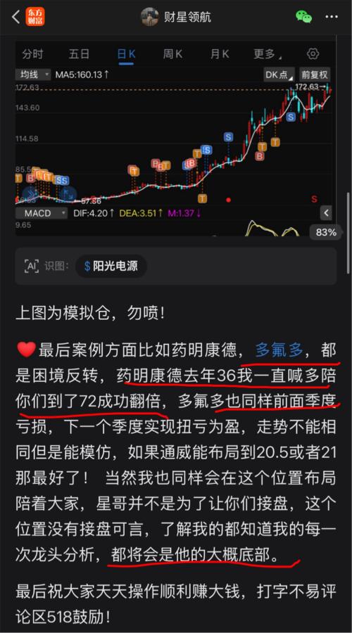 $通威股份(SH600438)$$阳光电源(SZ300274)$$多氟多(SZ002407)$我不能让所有人关注我,但是我尽量让关注星哥的人都赚到钱,并且赚的踏实,稳!通威股份的涨停意料之中,现在我说翻倍应该会有人信一点点了,28号当天下跌明确让买,并且宣布晚上出详细购买指南。 28号晚上星哥太忙没出贴,29号早上九点出贴详细指明购买原因,当天开盘上午涨停, 现在回头看是不是这回事儿? 目前一周已...