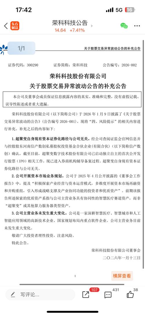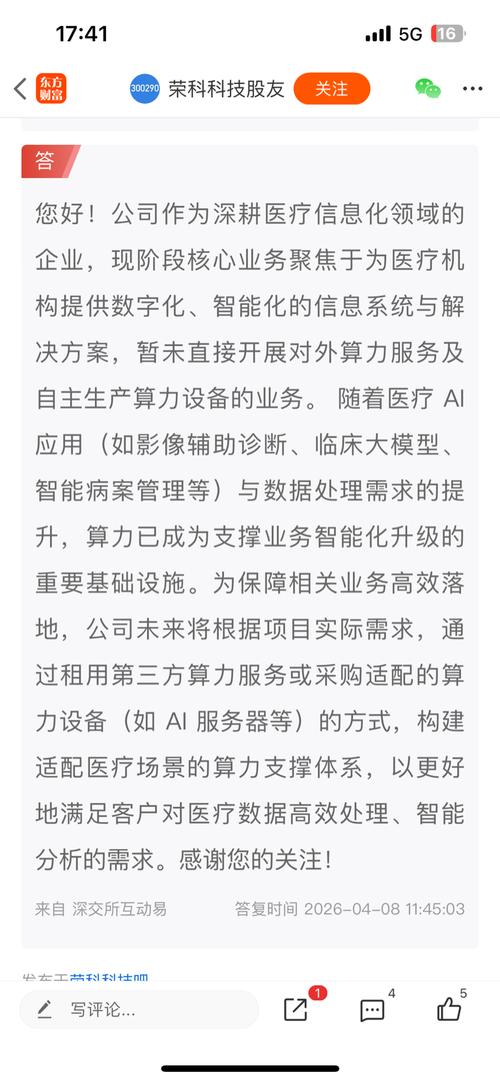$荣科科技(SZ300290)$2026年1月13日的异常波动补充公告,贵司有这么一段话:前期该报告所述探索的优质资产系指与公司主营业务具有协同性的智慧医疗赛道资产,而非“超聚变”或其他算力服务器类型资产。 今日董秘回复又有这么一段话:算力已成为支撑业务智能化升级的重要基础设施。为保障相关业务高效落地,公司未来将根据项目实际需求,通过租用第三方算力服务或采购适配的算力设备(如AI服务器等)的方式,...
