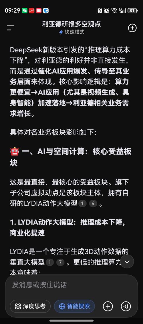 $利亚德(SZ300296)$2025年2月9日据利亚德集团全资子公司虚拟动点消息,日前,虚拟动点动作大模型LYDIA已接入DeepSeek。LYDIA对空间动作数据的认知、感知、理解及生成能力再升级,尤其在动作精准度及动作效果层面得到了进一步提升。