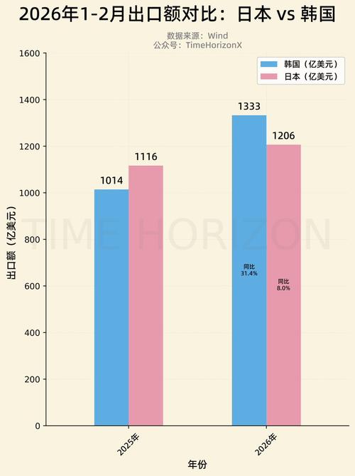 韩国出口还在激增,去年年底出口超了日本,今年前两月和日本差距已经拉到10%以上了。
