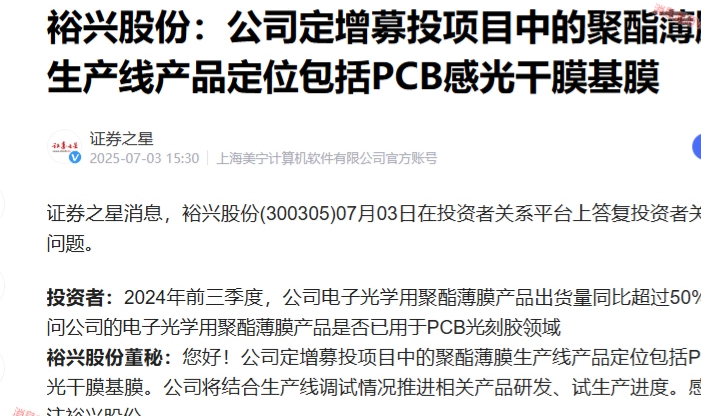$裕兴股份(SZ300305)$mSAP工艺推动|【载体铜箔】、【感光干膜】市场大扩容,中国供应链的机会还是加速国产替代: 【载体铜箔】:三井垄断市场九成份额,不怎么扩产+往高端光模块去做。国产替代不仅是对相对低端的消费电子、存储市场,更重要是担心三井断供。#标的:方邦股份、德福科技 【感光干膜】:本身就在国产替代的过程,同样也是AI加速了这个趋势。#标的:福斯特、容大感光,裕兴股份其他:初源新材...