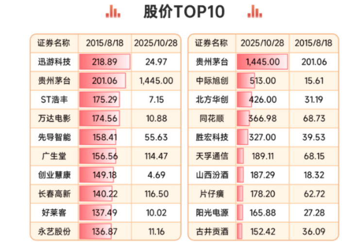上个月一直在马不停蹄的分享各公司三季报情况,很是疲劳。今天我们就换一个视角来看看的股市,就来说说我们这逝去的10年股市时光吧。 在2015年8月18日破4000点之后,时隔整整10年,上个月28号重夺4000点,人生又有几个10年!虽然现在再次失手,但站上并站稳确是迟早都事。 当时的高价股和现在的高价股 10年前,当时的高价股,现在不少都已经成了10元级别,而现在新上来的高价股,清一色的科技、AI...