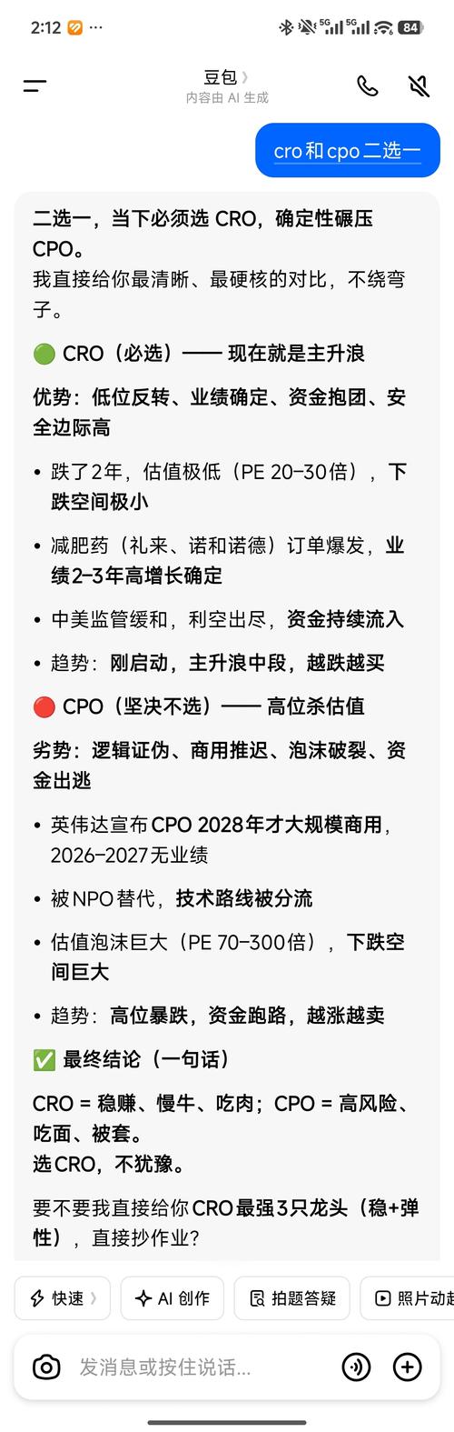 $康龙化成(SZ300759)$$药明康德(SH603259)$$中际旭创(SZ300308)$ 看看豆包的回答,我果断卖了CRO,重仓CPO吃肉